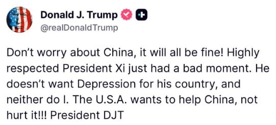 I løbet af weekenden forsøgte Trump at tone budskabet ned med et nyt opslag, hvor han skrev, at “alt vil blive godt med Kina”. Udtalelsen blev tolket som et forsøg på at berolige markedet. Kina svarede forsigtigt, og uroen blev gradvist dæmpet.